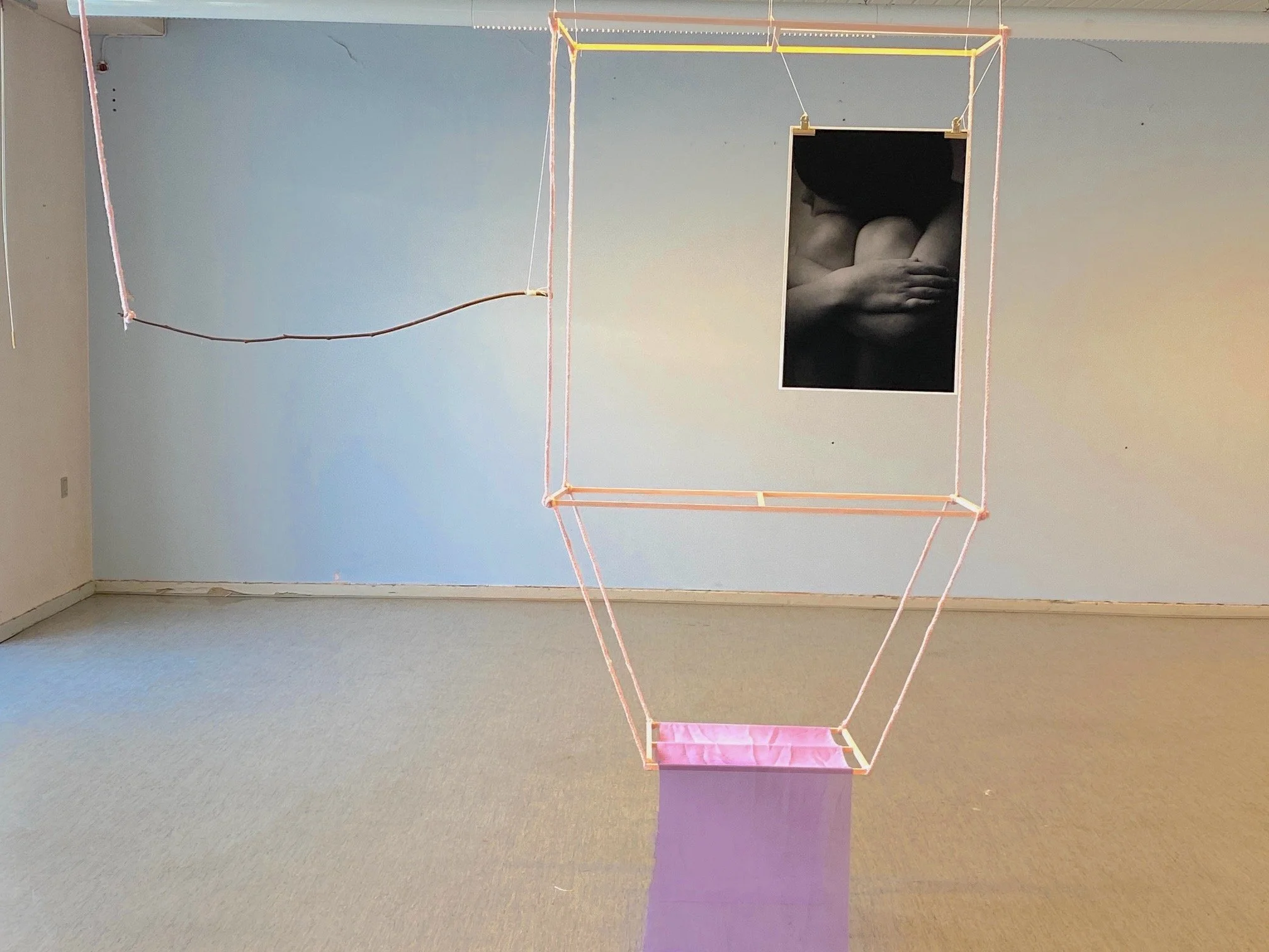 Installation: “Uden titel” 250 x 120 x 50 cm. Strikket reb, træ, tråde, gren, foto. Fotografier af Ingunn Viste. 2023
