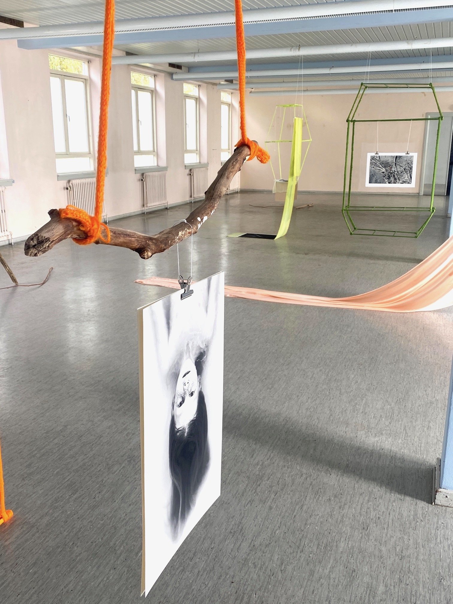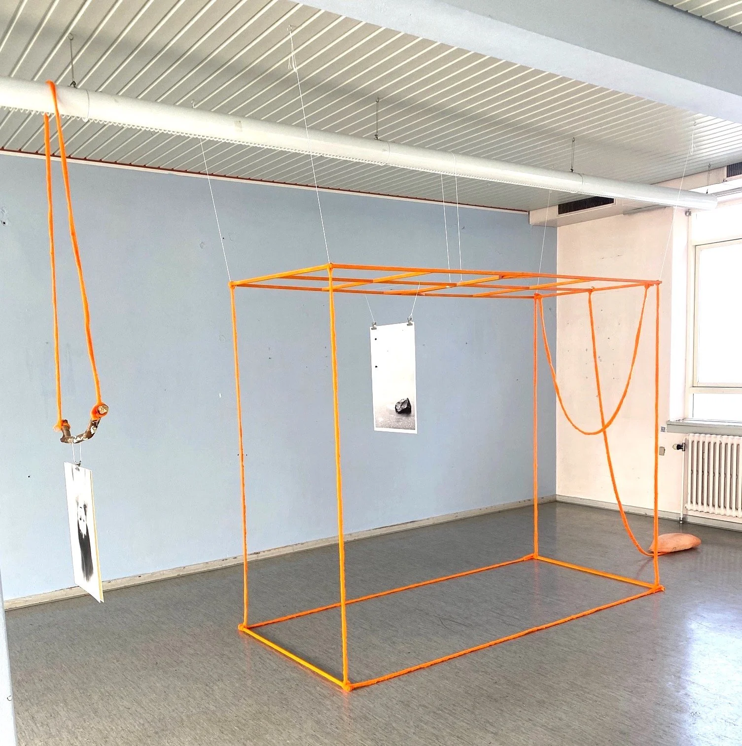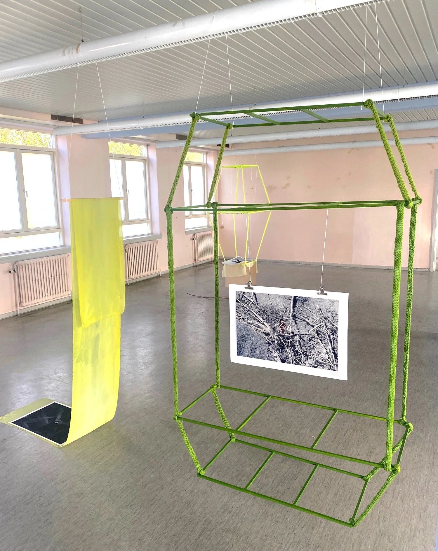 In this show I'am working with geometrical hanging constructions. Fragile transparent constructions of strings and ropes of knitted yarn, thin wood sticks and textiles. Framing and containing spaces in air.